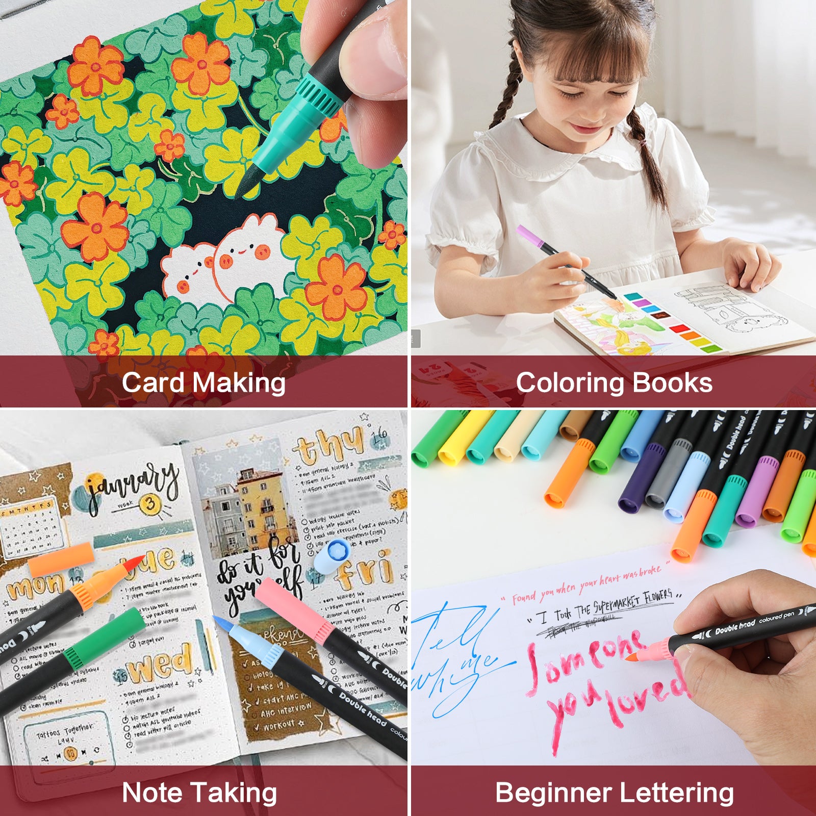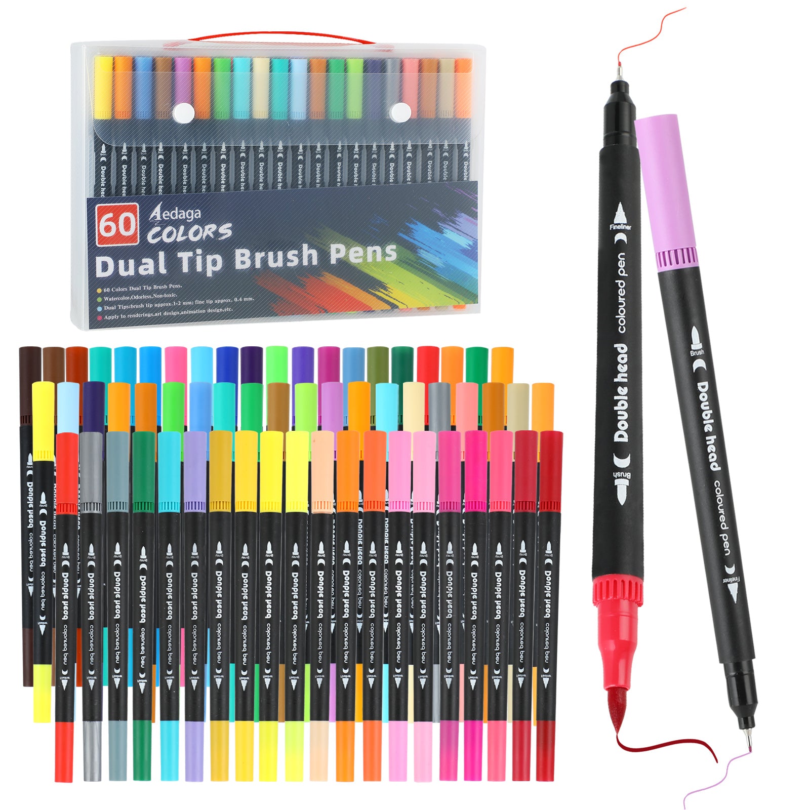 - đăVibrant Colorsă 60 colors duo tip brush coloring pens. The high-quality water-based ink seamlessly blends, creating beautiful coloring effects without worrying about smudges or uneven coloring. The rich and vivid colors inspire artistic creativity and allow for easy layering and mixing.